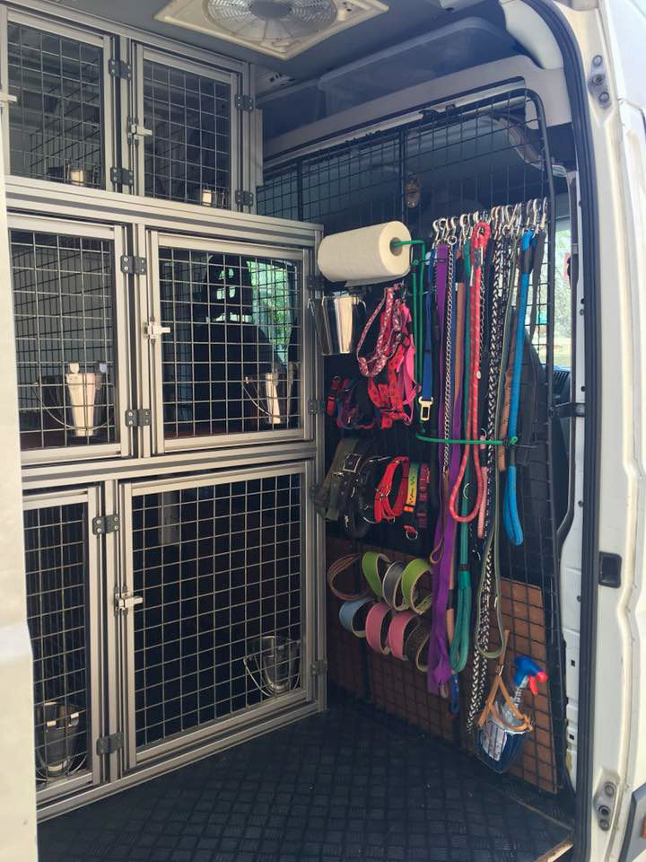 Nuestro vehículos tienen a tu disposición jaulas de aluminio y acero de todos los tamaños, desde gigantes hasta pequeñas, todas con bebederos y cierres independientes de seguridad.